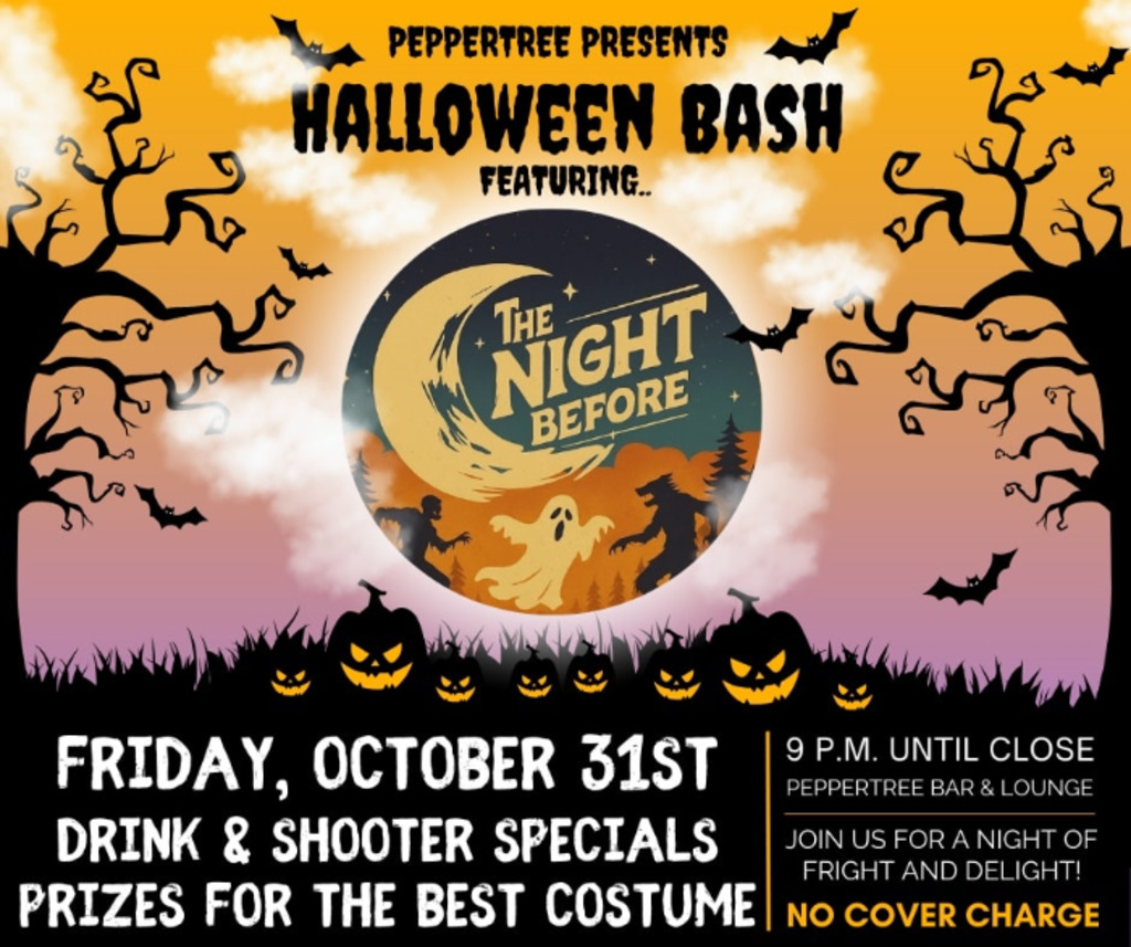 Come out for a Halloween BASH at PepperTree featuring 'The Night Before' band. Drink specials and no cover charge.