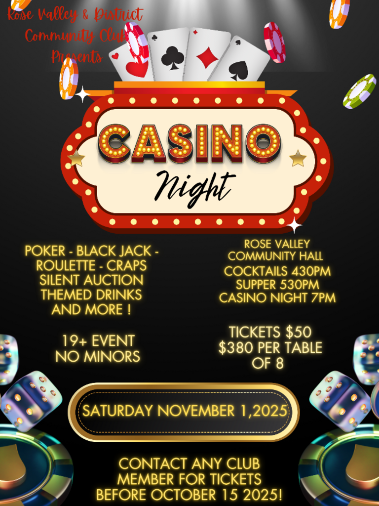 Rose Valley and District Community Group is hosting their annual fundraiser. Welcome to Vegas Casino night is happening November 1,2025 at the Rose Valley Community Hall. Doors open at 430pm and Supper will be at 530pm followed by Casino Night. Dress in your best black attire or glitz and glam and spend the night in Vegas ! There will be a silent auction and so much more ! Get your tickets now ! $50 per ticket or $380 per table of 8. Tickets on sale til October 14,2025 ! Contact 306-383-7321 to get your tickets !