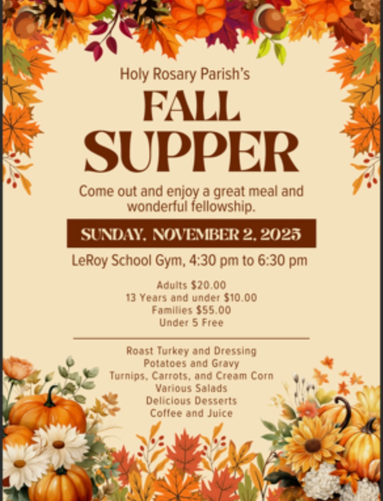 Fall Supper of Turkey, Dressing and all the trimmings with a huge selection of salads and desserts.