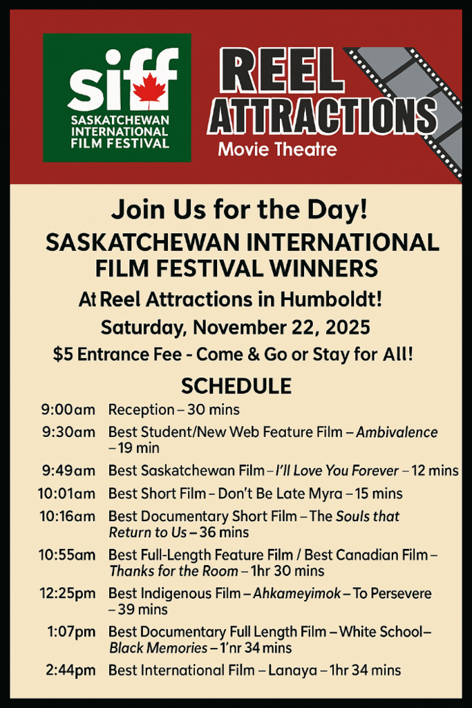 Come and enjoy a day of International films at Reel Attractions in Humboldt! We are honoured to be asked to once again host this SIFF Event!