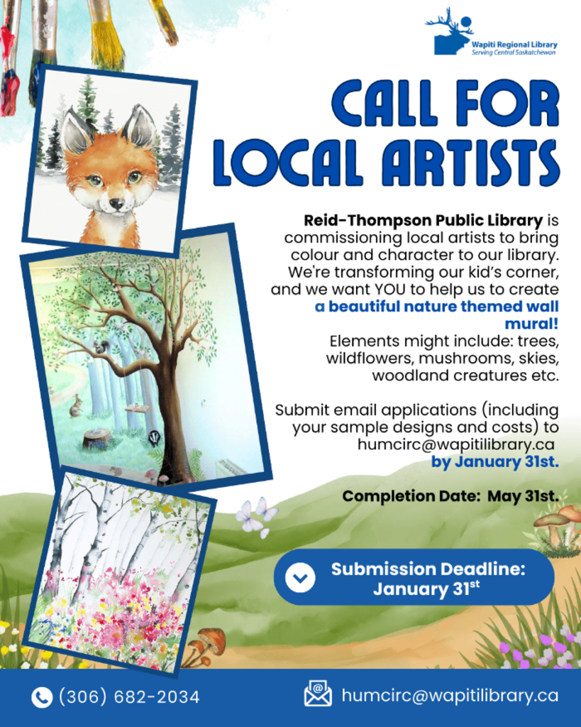 Reid-Thompson Public Library is creating a children's storytime corner, and a whimsical forest mural will give it the last touch it needs! Our Facebook and Instagram have a picture of the space for artists to use as reference, but everyone is welcome to visit us in person and snap some of your own photos. January 31st is the last day to submit your applications, including the estimated costs for your service, by email to humcirc@wapitilibrary.ca! Feel free to reach out to us on our socials, by phone or by email with any questions. We can't wait to see what you'll create!