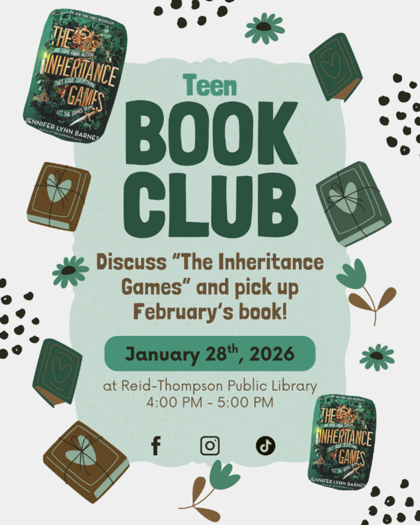 Join us at 4:00PM at Reid-Thompson Public Library to discuss The Inheritance Games by Jennifer Lynn Barnes! Make sure to visit the library before then to pick up your own copy to read before the meeting. Then, come join the discussion, enjoy some snacks and pick up February's book! All Book Club members will also get to have an opinion in all future books we read, so even if this one wasn't your style, join the meeting and have your voice heard so the next ones will be!