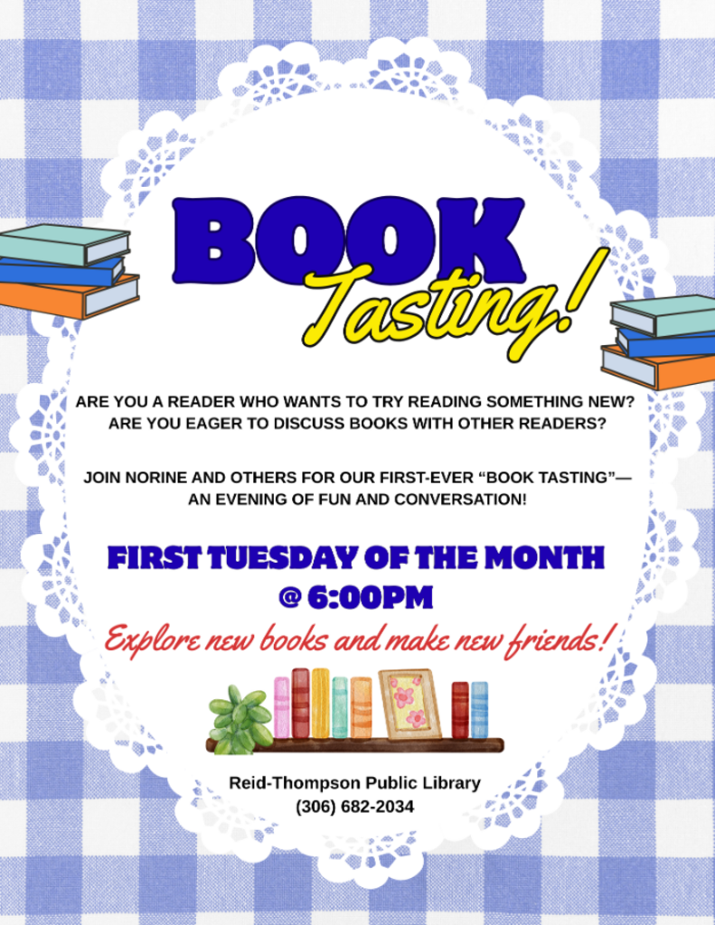 Make sure you stop by Reid-Thompson Public Library on January 6th at 6:00PM to join our Book Tasting! Chat with other readers about their favourite books and get specific recommendations from others for all your future book-ish needs. we always welcome new faces, so don't be shy if you've never joined before! The more the merrier!