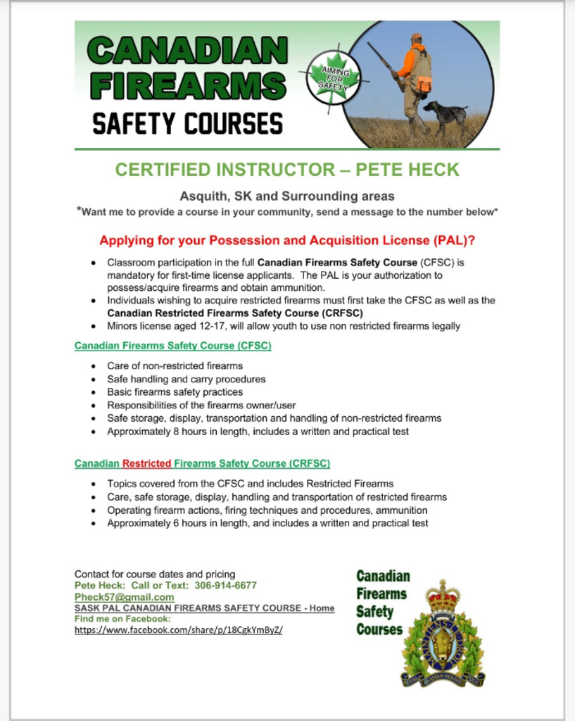 Date: January 10th Join instructor Pete Heck (RCMP certified) for a one-day Canadian Firearms Safety Course.
