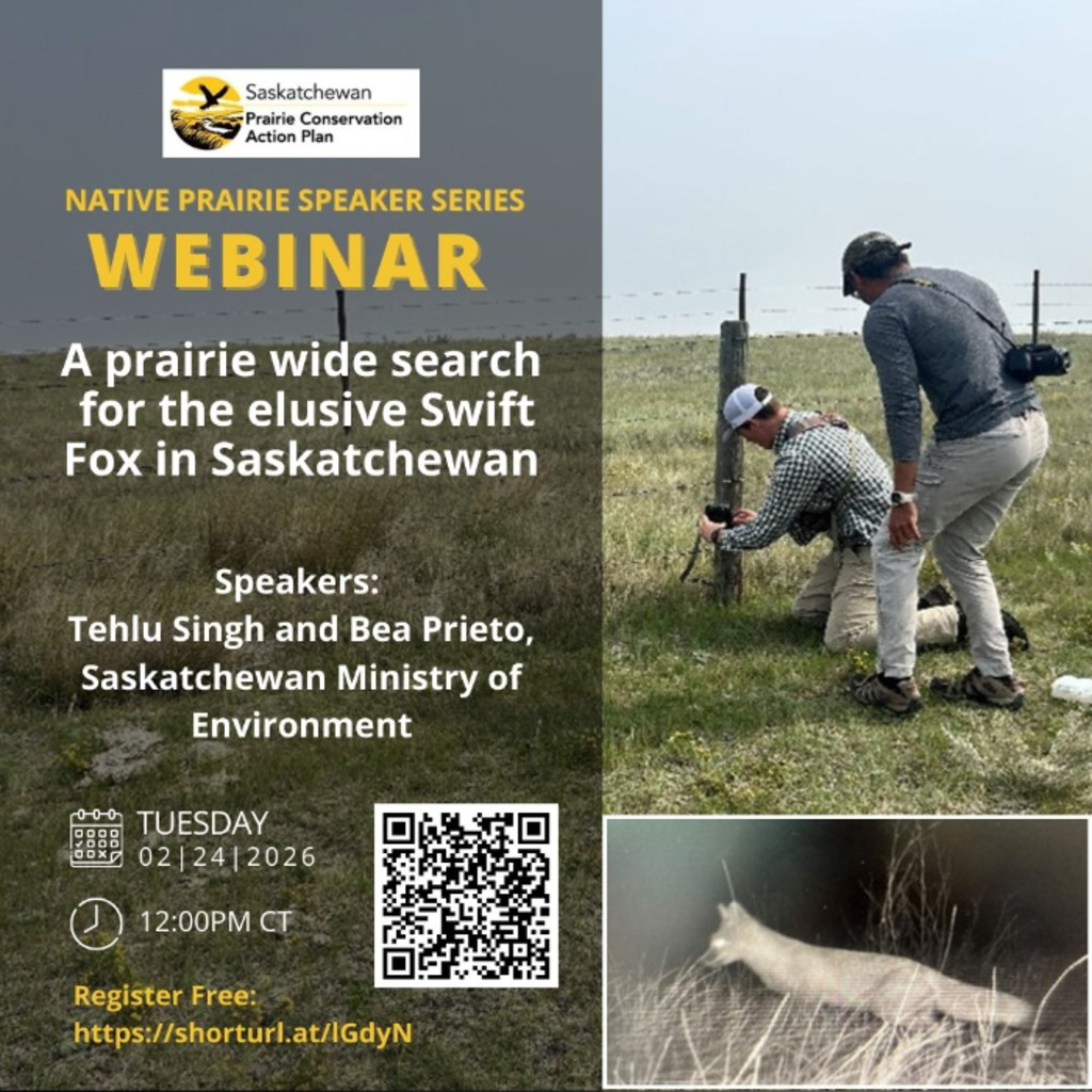 This webinar will provide an overview of the 2025 Swift Fox survey that was led by the Saskatchewan Ministry of Environment to update this species’ distribution in our province. This survey covered a total of 472 camera stations in the southwest part of the province. We want to thank all organizations that provided support and all producers that allowed us to access their land to setup the cameras, we could not have done it without them all!