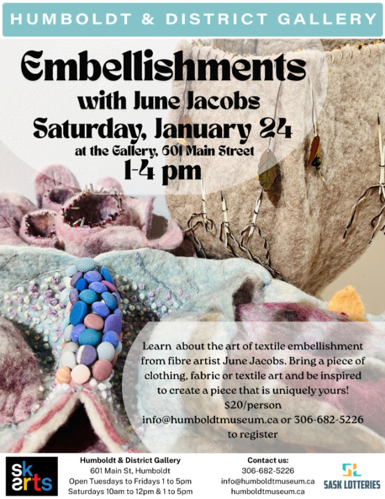 Learn about the art of embellishing textiles with fibre artist June Jacobs. Bring a piece of fabric, a piece of clothing, an unfinished textile project like quilting, knitting, felting or anything textile that you think could use some embellishment. June will show you examples of how she embellishes her own artworks with dyes, embroidery, buttons, found objects, machine stitching, quilting, buttons, beads, notions, and can suggest ways to turn your piece into something uniquely yours.
