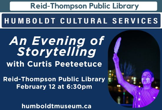 As part of Saskatchewan Indigenous Storytelling Month, Humboldt Cultural Services and Reid-Thompson Public Library are pleased to present An Evening of Storytelling with multidisciplinary artist Curtis Peeteetuce. Join us for this unforgettable night of traditional and contemporary stories at the Library from 6:30pm to 7:30pm. This event is free and all are welcome, and encouraged, to come!
