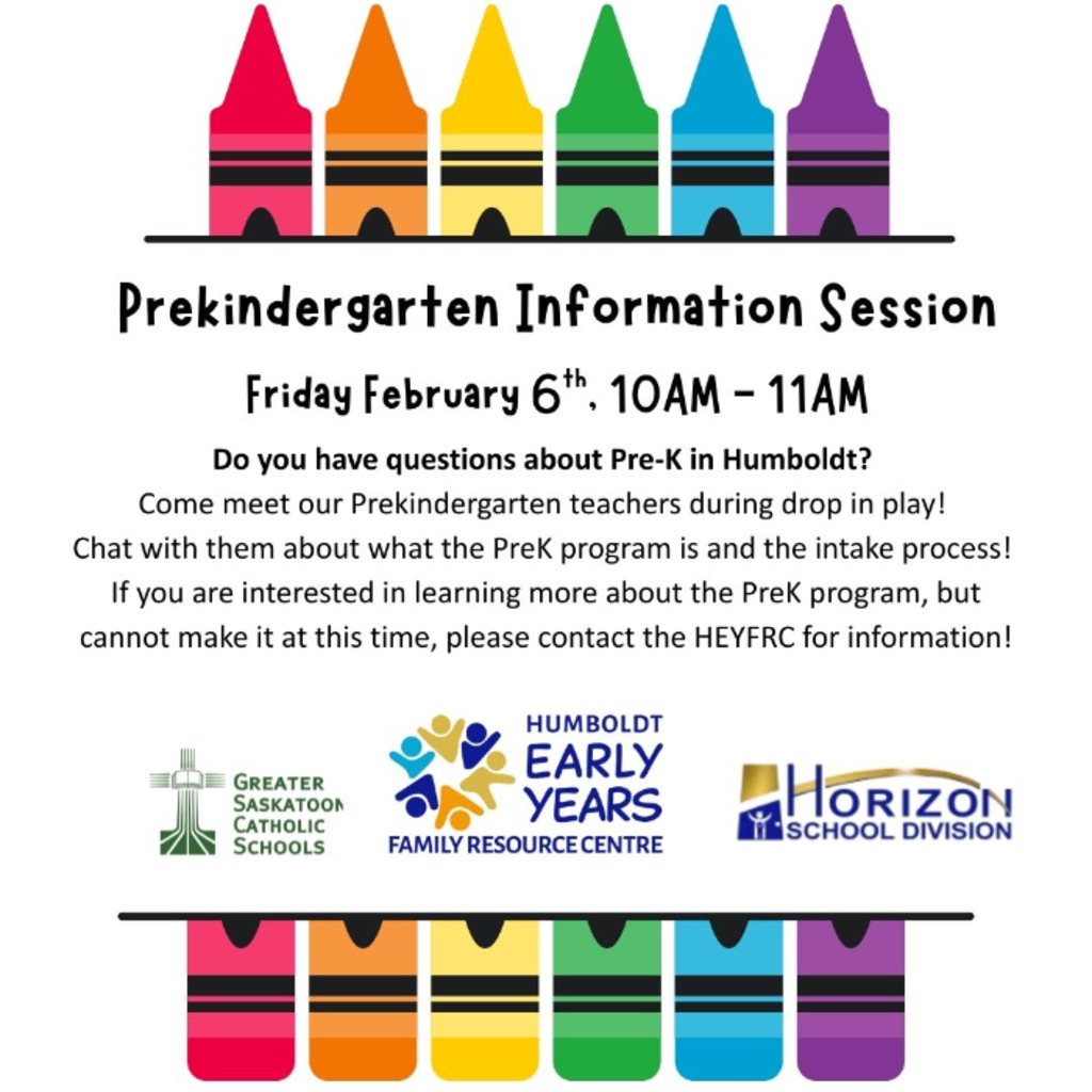Are you considering Pre-K for your 3 or 4 year old in one of Humboldt's elementary schools? Come meet the teachers at the HEYFRC during drop in play to ask any and all of the questions you may have about Pre-K. This is a FREE opportunity to learn about the educational options available in Humboldt. Teachers will be available Friday February 6, 10:00 - 11:00 AM at the HEYFRC.