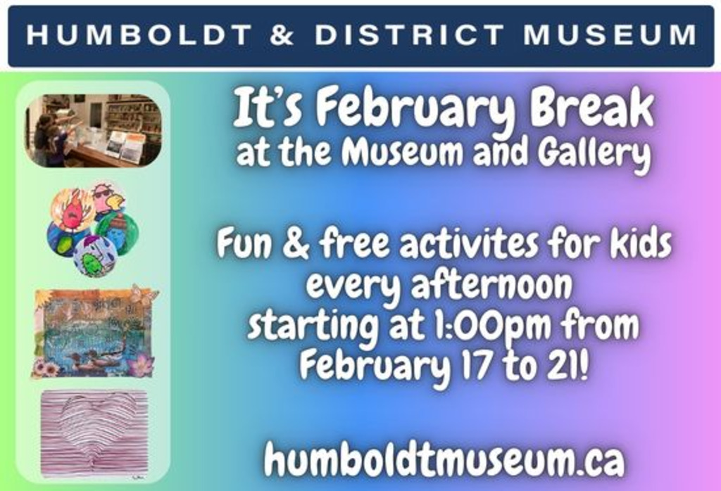 Spend February school break with us at the Museum and Gallery! We'll have fun & free programs for kids everyday in both buildings. Drop-in for a short visit or stay all afternoon - there's plenty to do! Each activity will be available everyday, so you can keep coming back all week long.