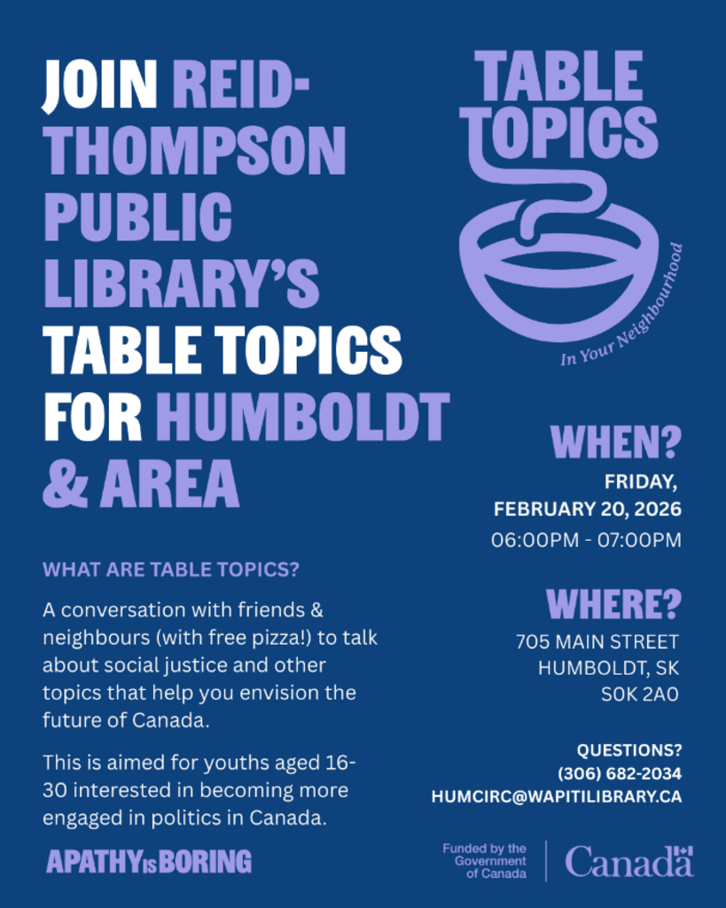 Are you a big fan of pizza and friendly community discussions? Luckily for you, we will be hosting another Table topics discussion at Reid-Thompson Public Library on February 20th at 6:00PM for all youths ages 16-30 with just that! Since it will be International Social Justice Day, we thought it only appropriate to focus our discussions around just that: social justice. Whether you're intimately familiar with the political happenings in Humboldt & Area or want to try learning about it, this is the perfect event for you! We'll even have free pizza for all attendees, so spread the word!