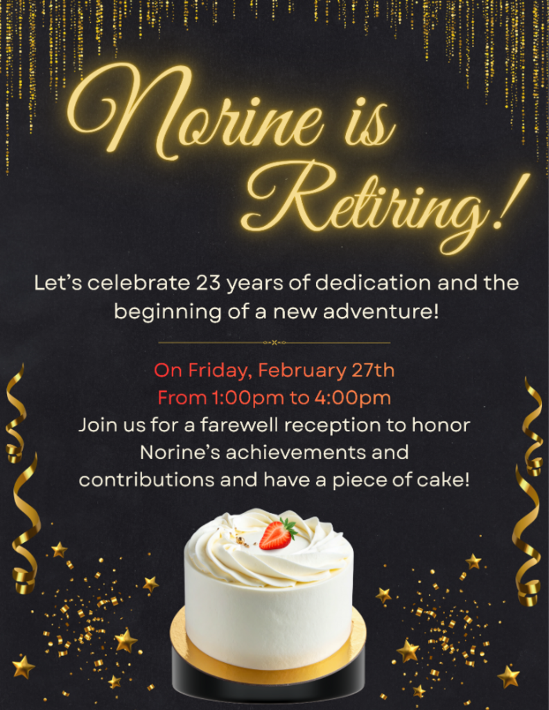 Norine is a beloved member of the Reid-Thompson Public library staff, and she has announced her retirement. On February 27th at 1:00PM, we will be hosting a small party for her at the library open for everyone to attend! We will have cake and light refreshments to celebrate the many years Norine has dedicated to this community. Please join us in a glad farewell!