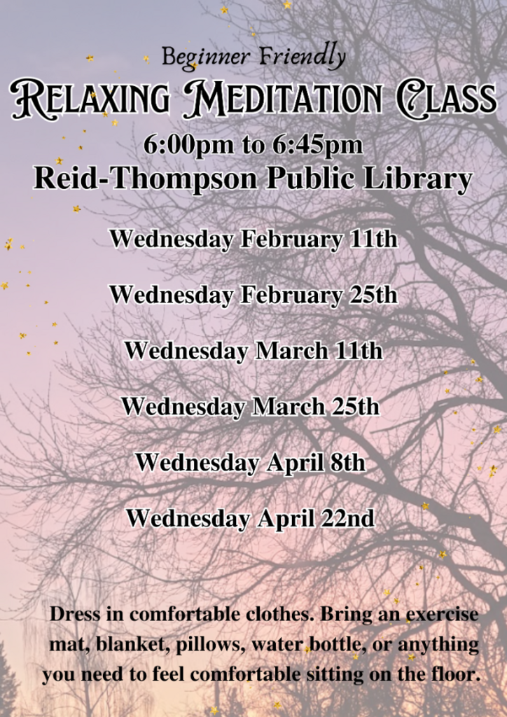 Head over to Reid-Thompson Public Library for some beginner-friendly meditation! Bring your water, an exercise mat and whatever else you need to be comfortable on the floor and get some much needed relaxation in!
