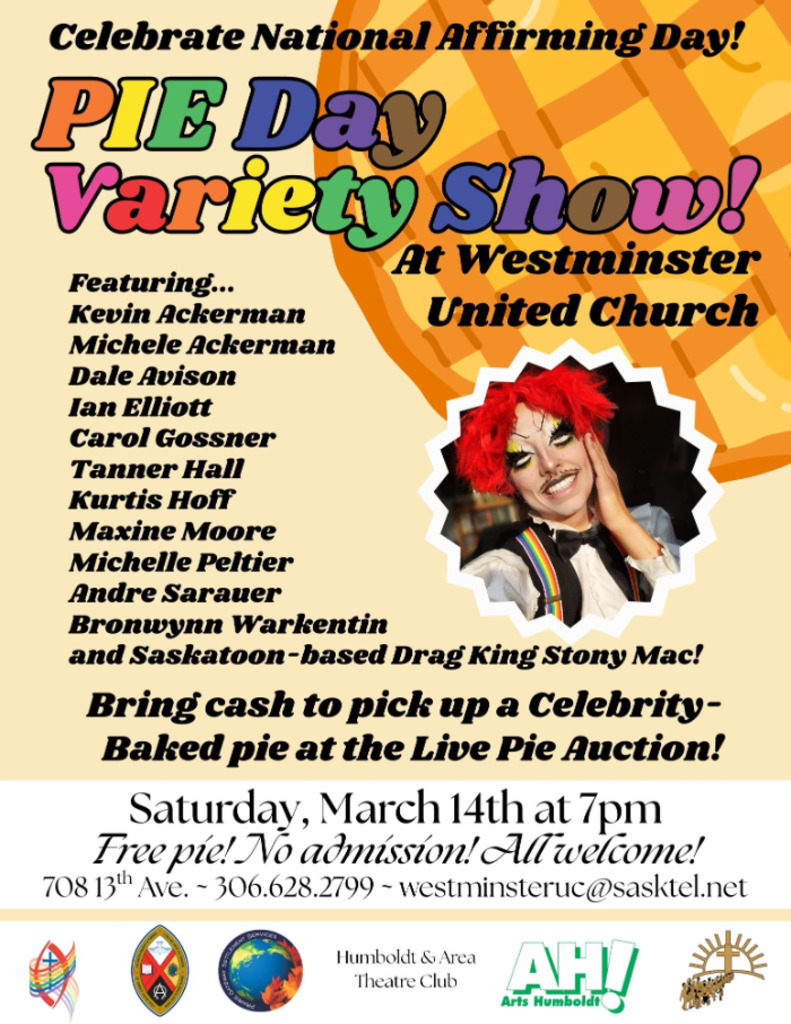 Celebrate National Affirming Day with Westminster United Church at the annual PIE Day Variety Show. PIE Day celebrates the Public, Intentional, and Explicit acceptance of everyone!