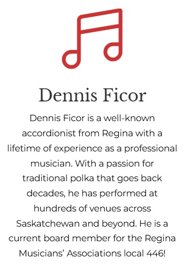 Dennis Ficor is a celebrated accordionist who has spent a lifetime performing in various bands across Saskatchewan. Over the years, he has shared the stage with many well-known performers and recording artists, including Buddy Knox, Brian Sklar, Mel West, Brad Johner, Jack Semple, Rick Morgenstern, and many more. His exceptional talent and versatility have made him a staple in the local music scene, earning him a reputation as one of Saskatchewan's finest musicians.