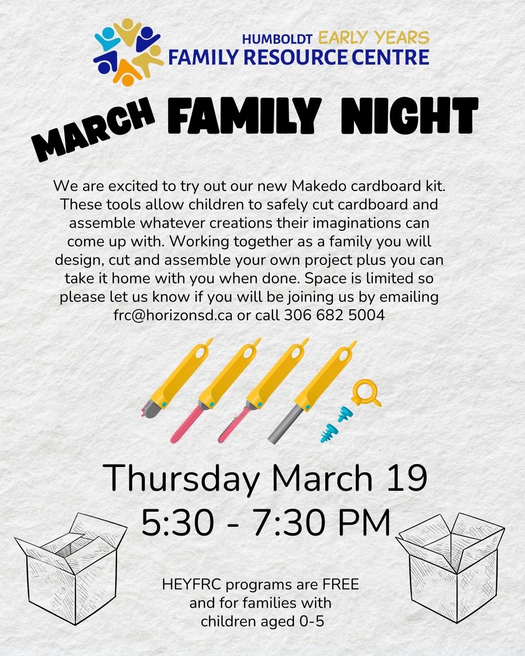 Join us at the HEYFRC for some family Makedo building. Our Makedo kits are safe ways to allow your child to cut cardboard. Design, cutout and create your very own masterpiece plus you get to take it home! This FREE program is open to families with children aged 0-5 but you must preregister by emailing frc@horizonsd.ca as space is limited.
