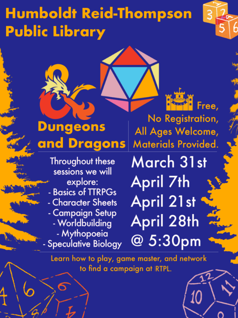 All ages and experience levels are invited to the library to learn all about playing in a D&D campaign and running their own! They had their first session on March 31st, but three more have been scheduled for April 7th, 21st and 28th, all at 5:30PM. You can come to one or all three, whatever is accessible to you! You might even walk away with a group to start a campaign with, so what are you waiting for? Mark your calendars!